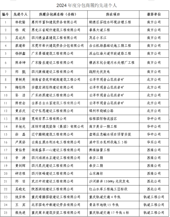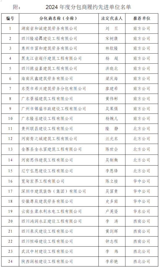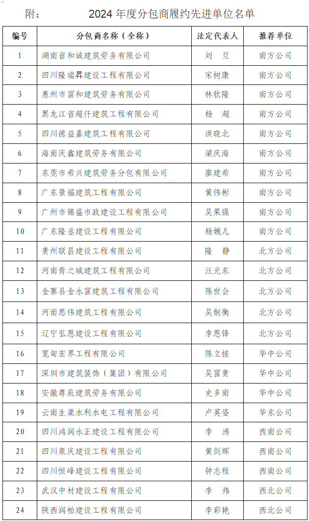 2024年度分包商履约先进单位及先进个人评选结果公示 | ||