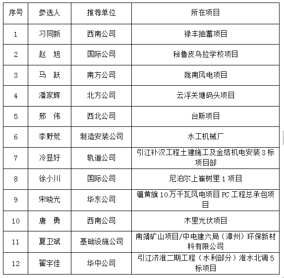 根据《中国水利水电第六工程局有限公司优秀项目经理评选办法(2025版)》(六局工管〔2025〕24号),公司开展了2025年度优秀项目经理评选工作,历经各分公司推荐、公司总部相关部门初审、评选委员会终评,公司党委会审议通过后,最终评选出2025年度公司优秀项目经理12名,评细名单见下表。 2025年度公司优秀项目经理公示名单